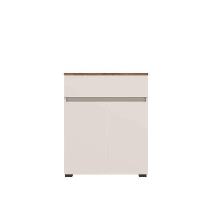 Тумба KOM2D1S АНСІ дводверна з шухлядою – елемент модульної системи Ansi. Виготовляється із ламінованої ДСП товщиною 16 мм в ефектному колірному поєднанні кашемір / дуб травіата. Задня стінка та дно шухляди виконані з ДВП 3 мм сірого кольору. Всередині закритого відділення розташована одна полиця. Використовуються кулькові напрямні повного висуву HAFELE та петлі SLIDE-ON HETTICH. Максимальне навантаження на стільницю становить 10 кг.