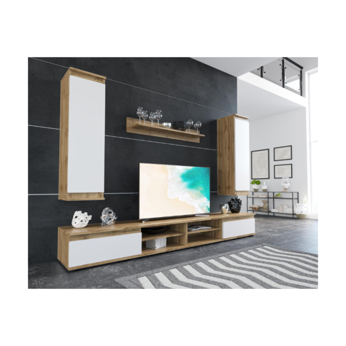 Вітальня ЛЮСІЯ 220 – практичний меблевий комплект у вітальню. Виготовляється з ДСП у трьох колірних рішеннях: німфеа альба, німфеа альба / бетон и дуб тахо / німфеа альба. Характеризується стильним лаконічним дизайном, простими геометричними формами та відсутністю класичних ручок. Відмінно підійде для облаштування невеликої вітальні.