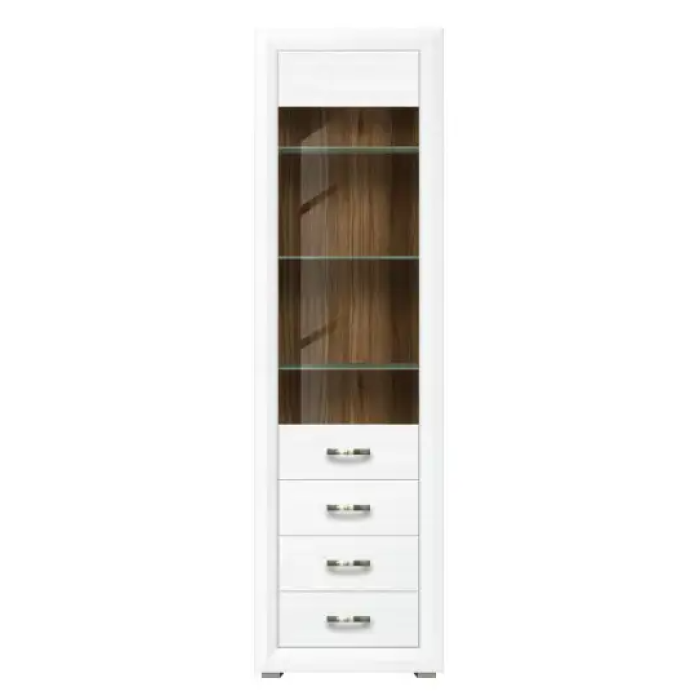 Вітрина REG1W3S МАРКУС БРВ однодверна з трьома шухлядами – елемент модульної системи Markus BRW. Виготовляється з ламінованої ДСП з накладками МДФ в ефектному колірному рішенні: джанні / дуб кам'яний. За дверима зі скляною вставкою встановлені три скляні полиці, які обладнані підсвіткою. Двері можуть навішуватися як з правого, так і з лівого боку.