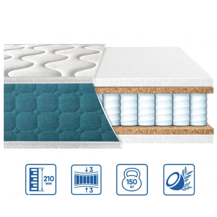 Ця модель підійде для тих, хто шукає якісний матрац із незалежними пружинами та кокосом. Матрац має однакову жорсткість з обох боків. Чохол виконаний із трикотажної тканини з об'ємним стеганням. Внутрішнє наповнення складається з ПОСИЛЕНОГО блоку "Pocket spring", посиленого ¦єврокаркас, термоповсть, піни «FLEXI» та кокосу з натуральним латексом.Незалежні один від одного пружини забезпечують точкову підтримку тіла та добре підтримують хребет.