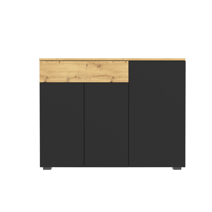 Тумба KOM3D1S РЕБЕКА тридверна з шухлядою – елемент модульної системи Rebeka. Виготовляється з ламінованої ДСП товщиною 16 мм у двох колірних рішеннях: дуб артизан / німфеа альба та дуб артизан / чорний. За лівими та центральними дверима розташована одна полиця. У правому відділенні встановлено дві полиці. Використовуються навісні петлі HETTICH SLIDE-ON, кулькові напрямні повного висування HAFELE та система відкриття HETTICH PUSH to OPEN MAGNET легким натисканням на фасад.