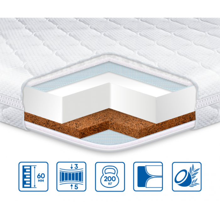 КОКОС З НАТУРАЛЬНИМ латексом - це матеріал з волокон кокосового горіха, просочений латексом. Природні вентиляція, еластичність, міцність, пружність, гігієнічність та антиалергенність. Цей матеріал не деформується, не вбирає вологу та не сипеться. Використовується в моделях, призначених для любителів жорсткішого та пружного спального місця.