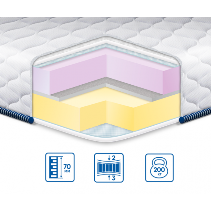 Дана модель одностороння з помірно м'якою жорсткістю завдяки поєднанню двох шарів піни AIRYFOAM та MEMORY. MEMORY надає топеру м'якість, а піна AIRYFOAM – пружність.