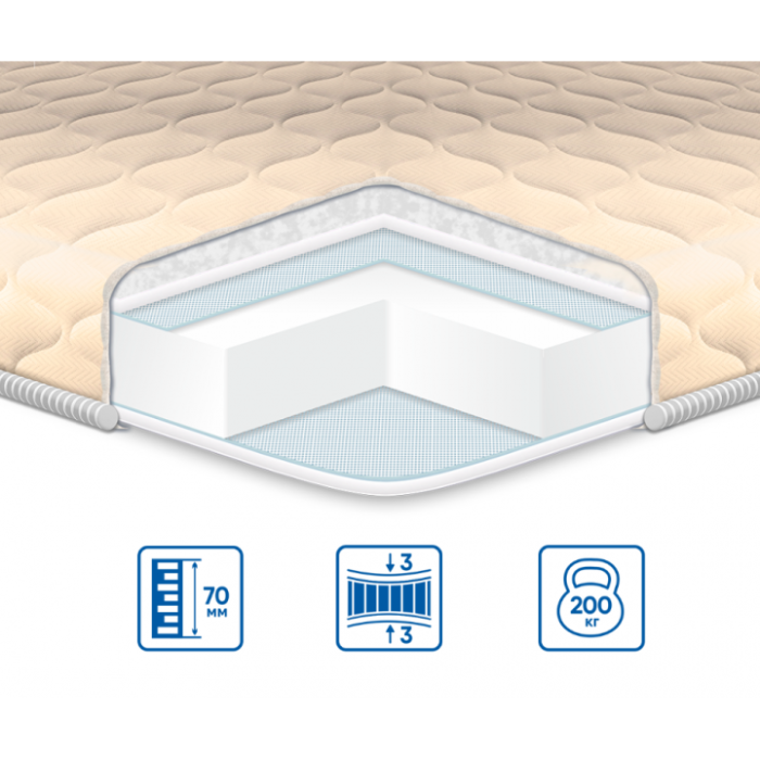 Ця модель одностороння із середньою жорсткістю. Завдяки шару піни AIRYFOAM топпер здатний згладити значні нерівності. Топпер зробить Вашу спальну поверхню рівною і зручною, він також може стати у нагоді на випадок, якщо до Вас завітали гості. Топпер ще називають тонким матрацом, і його можна використовувати як на матрацах, так і на підлозі.
